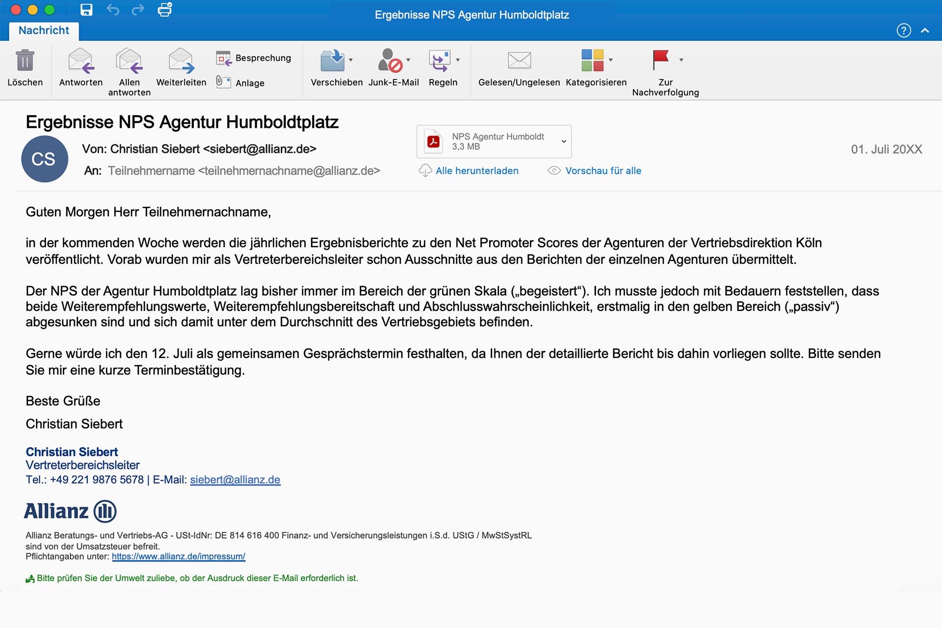 Nachfolgend eine E-Mail mit Anhang von Hr. Siebert (Vertreterbereichsleiter) zum Ergebnis des Net Promoter Scores (NPS).