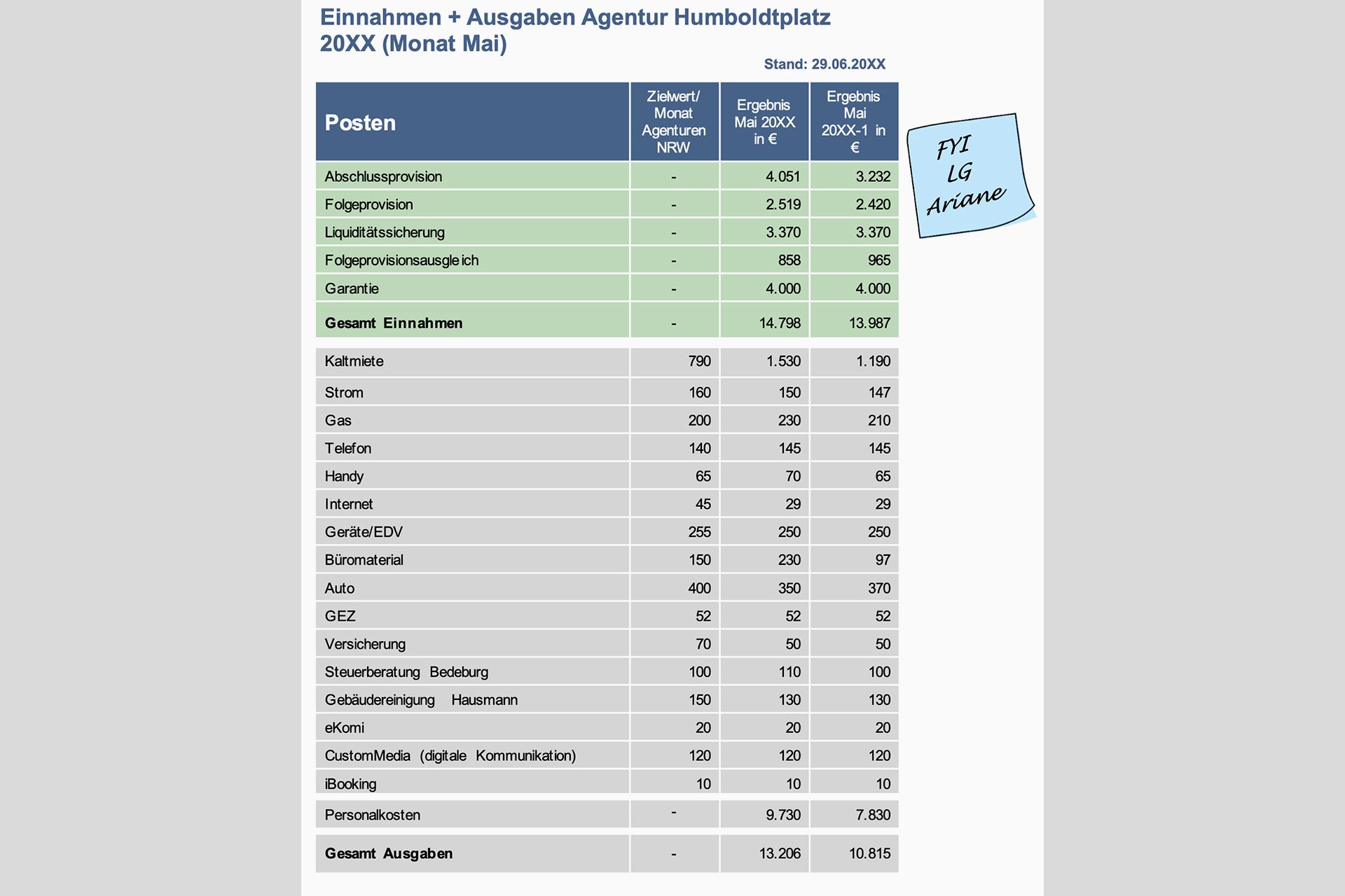 Ihre Sekretärin Frau Görek hat Ihnen die Einnahmen und Ausgaben der Agentur Humboldtplatz aufbereitet.