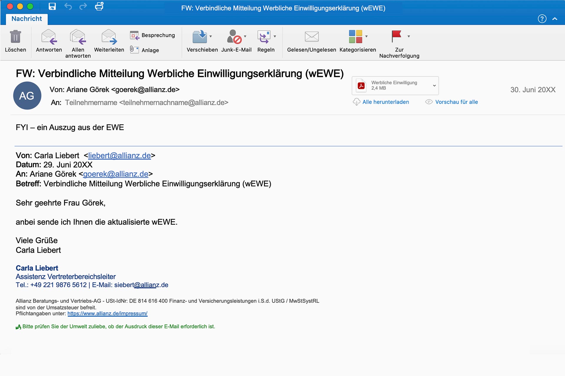 Nachfolgend eine von Fr. Görek (Sekretärin) weitergeleitete E-Mail zur werblichen Einwilligungserklärung (wEWE).