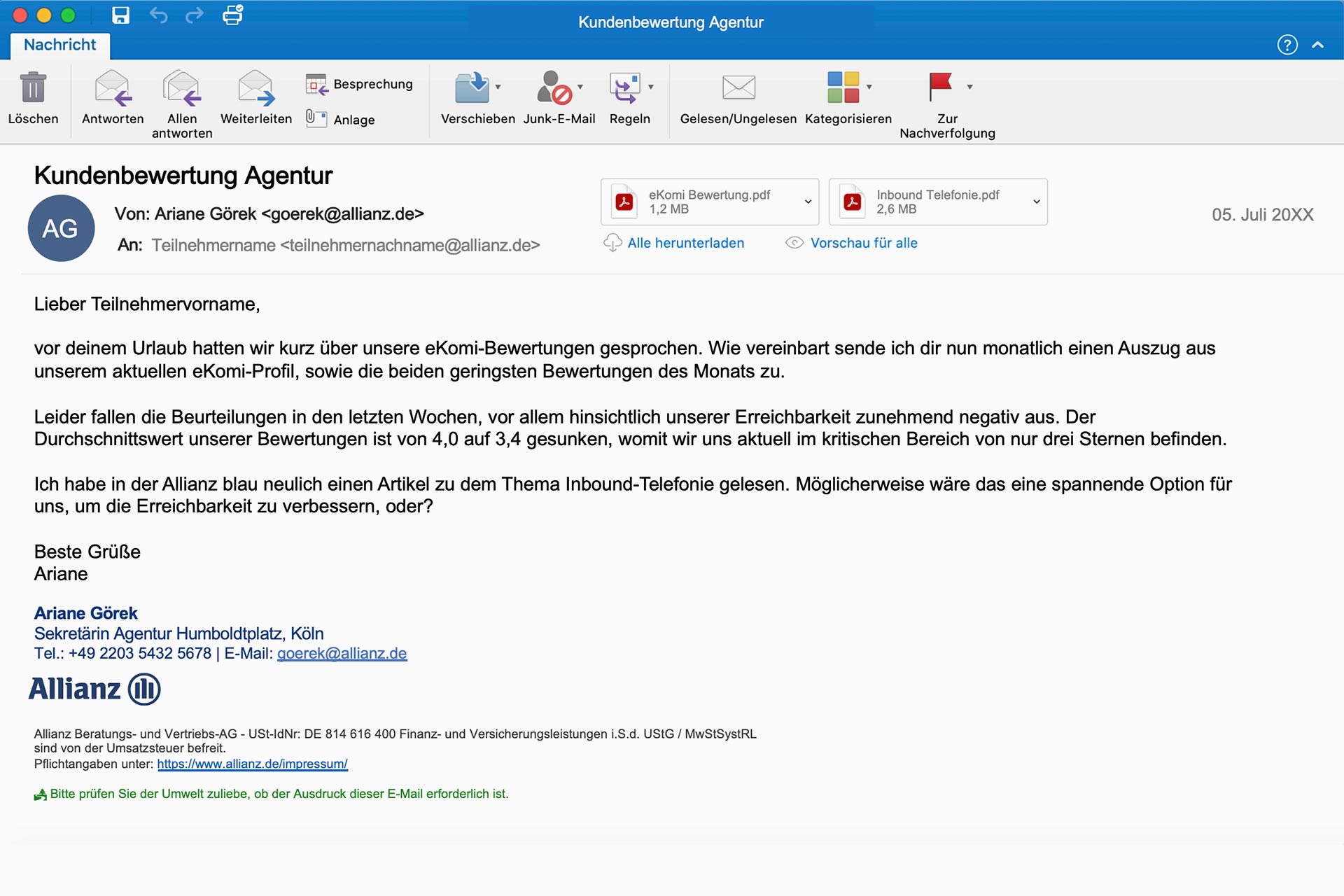 Nachfolgend eine E-Mail mit Anhang von Fr. Görek (Sekretärin) zur eKomi-Bewertung sowie Inbound-Telefonie.