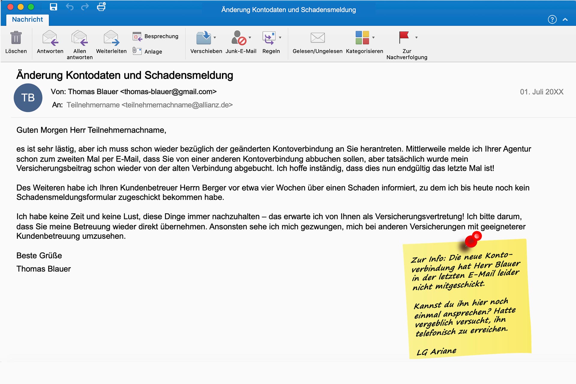 Nachfolgend eine E-Mail des Kunden Thomas Blauer bzgl. Kontodaten und Schadensmeldung.